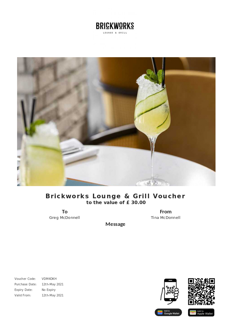 Buy a Brickworks Lounge & Grill gift card for an amount of your choosing. Send it as a gift to someone special, or treat yourself instead.